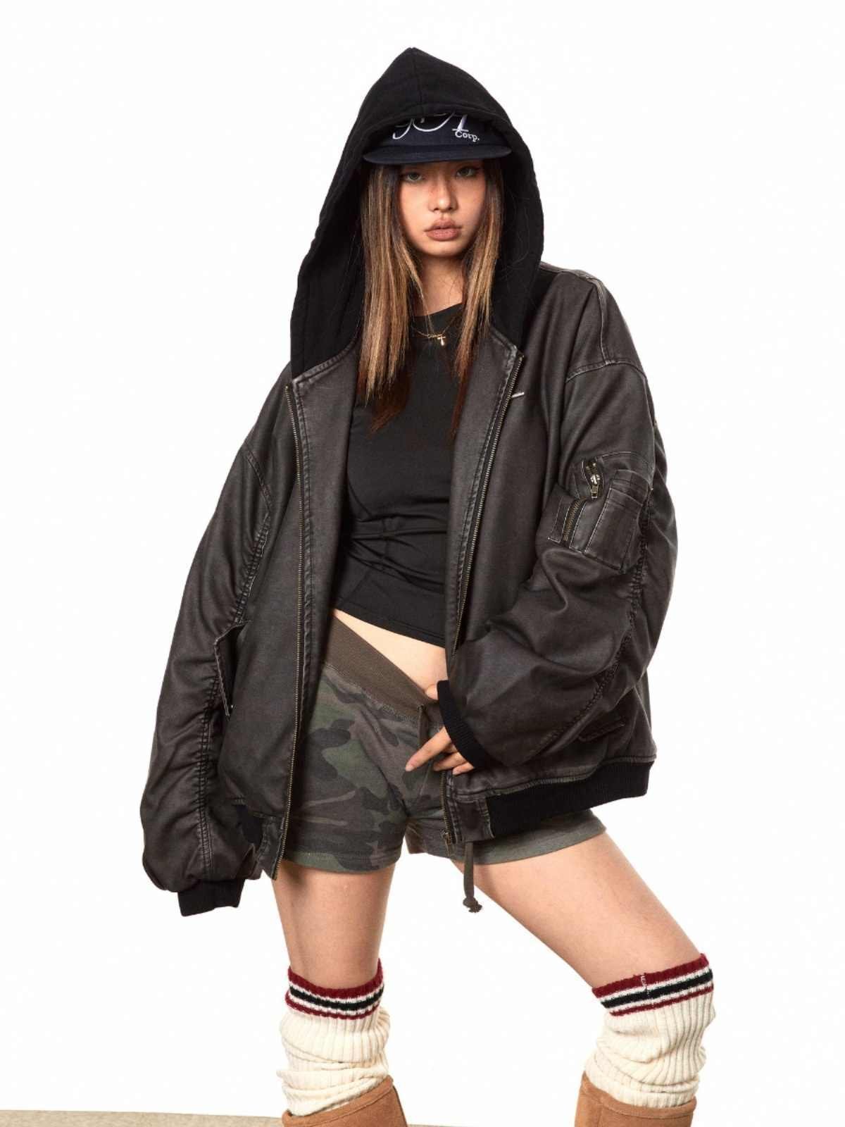 Vintage Distressed Leather Coat Hooded Cotton Jacket