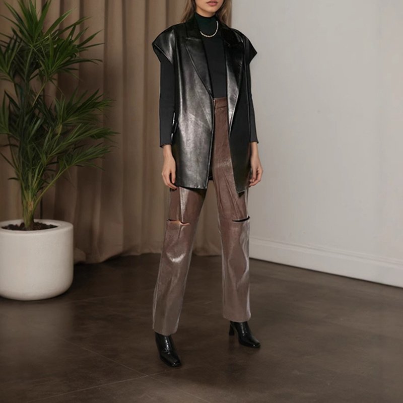 Crafted from a high-quality blend of 95% Polyester and 5% Spandex, this Edgy Faux Leather Material offers the best of both worlds. You get the sleek, rebellious look of leather with the practicality of modern synthetic fabrics. The 5% Spandex inclusion is crucial—it adds a touch of stretch, ensuring that the vest moves with you rather than feeling stiff or boxy. It is soft to the touch, lightweight, and durable enough for daily wear.